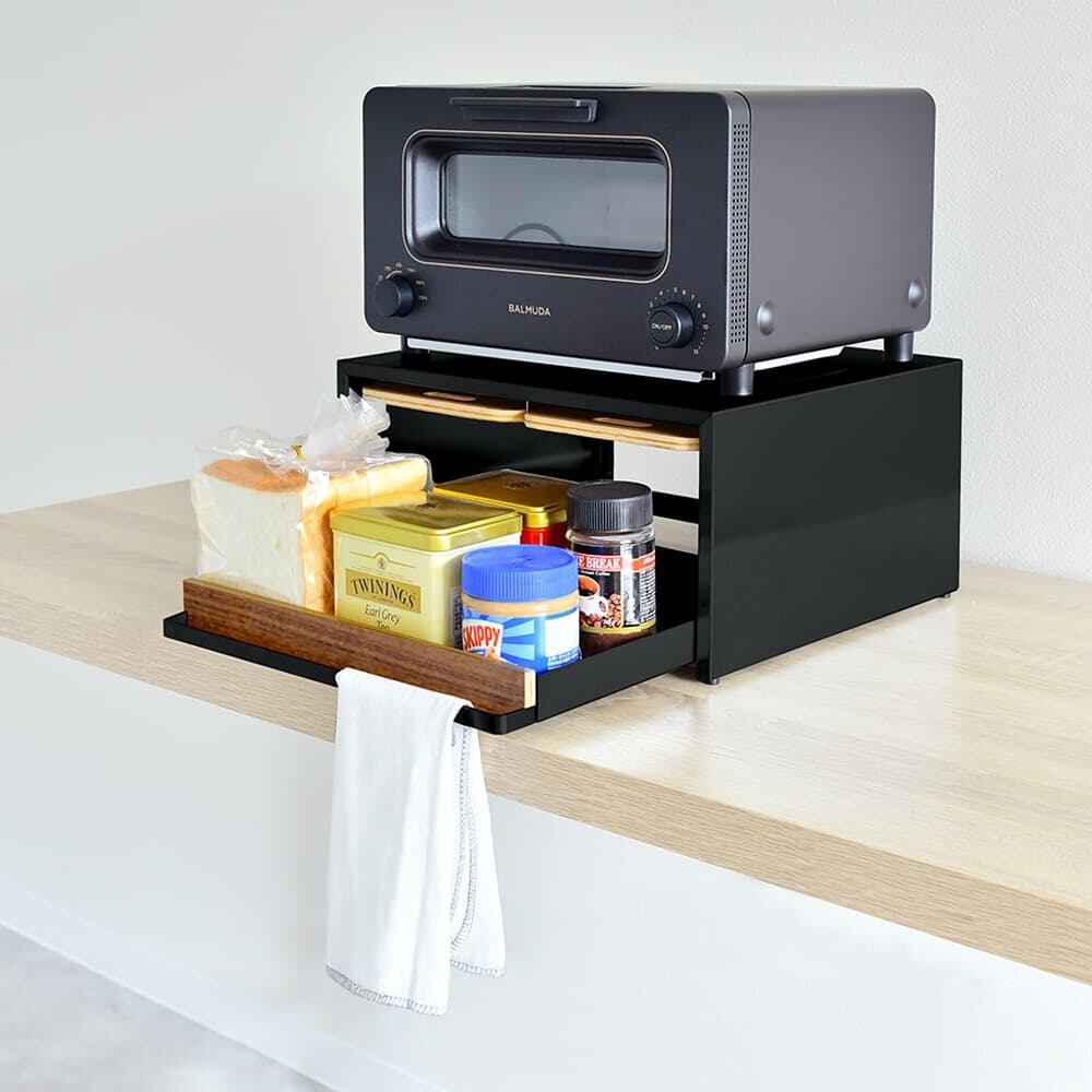 A factory トースターラック+トレー&収納:日本製 スチール 木製 バルミューダ トレイ付き 収納 パンケース コーヒー 引き出し ナチュラル 省スペース キッチン 隙間収納
