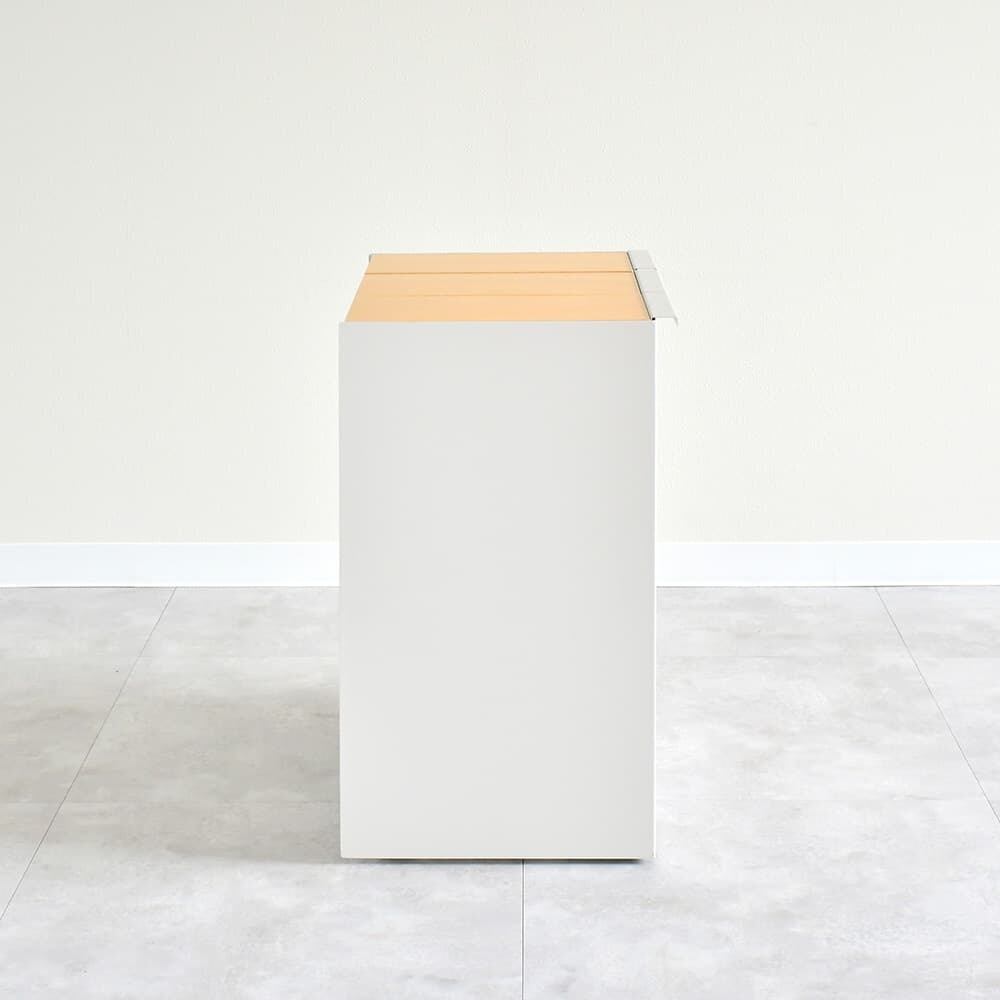 また、本体下部にはワイヤー棚を備えており、ゴミ袋のストックや古新聞・雑誌の一時保管にも活躍します。隠しキャスター付きで、壁際設置でもラクに移動可能。掃除のときも快適です。キッチンやリビングなど、どんな空間にも自然になじむミニマルなデザイン。「隠す」という発想から生まれたこのダストボックスは、「暮らしと調和する美しさ」を体現しています。